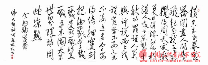 刘森林,男,一九七三年八月生,河北省赵县人,现居北京,号林霞居士,毕业于石家庄铁道学院(现石家庄铁道大学)并于一九九五年分配到中铁十六局集团工作,大学文化,学士学位。现为中华全国书画家联合会会员,中国毛泽东诗词书画艺术国际研究院院士研究员,中国毛体书法家协会理事。由于生在书香门第,自幼随父研习书法,先习唐楷,尤擅柳体,在中铁十六局工作十多年来,秉承读万卷书、筑祖国铁路之理念,遍游祖国大江南北。吾惊叹于祖国人杰地灵、山川秀美、疆土之广大;折服于华夏书法文化之源远流长、博大精深!